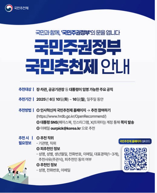 이재명 대통령이 ‘국민주권정부’라는 철학 아래, 인사 추천권을 국민에게 열었습니다. 지금까지 이런적이 없던 만큼 파격적인 행보가 아닐 수 없습니다.